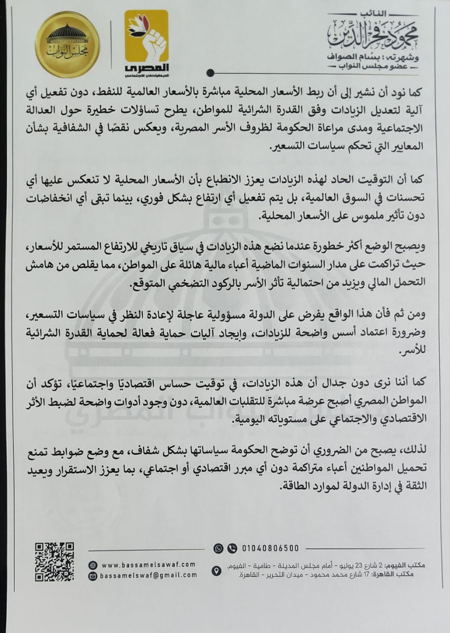 كما نود أن نشير إلى أن ربط الأسعار المحلية مباشرة بالأسعار العالمية للنفط، دون تفعيل أي آلية لتعديل الزيادات وفق القدرة الشرائية للمواطن، يطرح تساؤلات خطيرة حول العدالة الاجتماعية ومدى مراعاة الحكومة لظروف الأسر المصرية، ويعكس نقصًا في الشفافية بشأن المعايير التي تحكم سياسات التسعير.