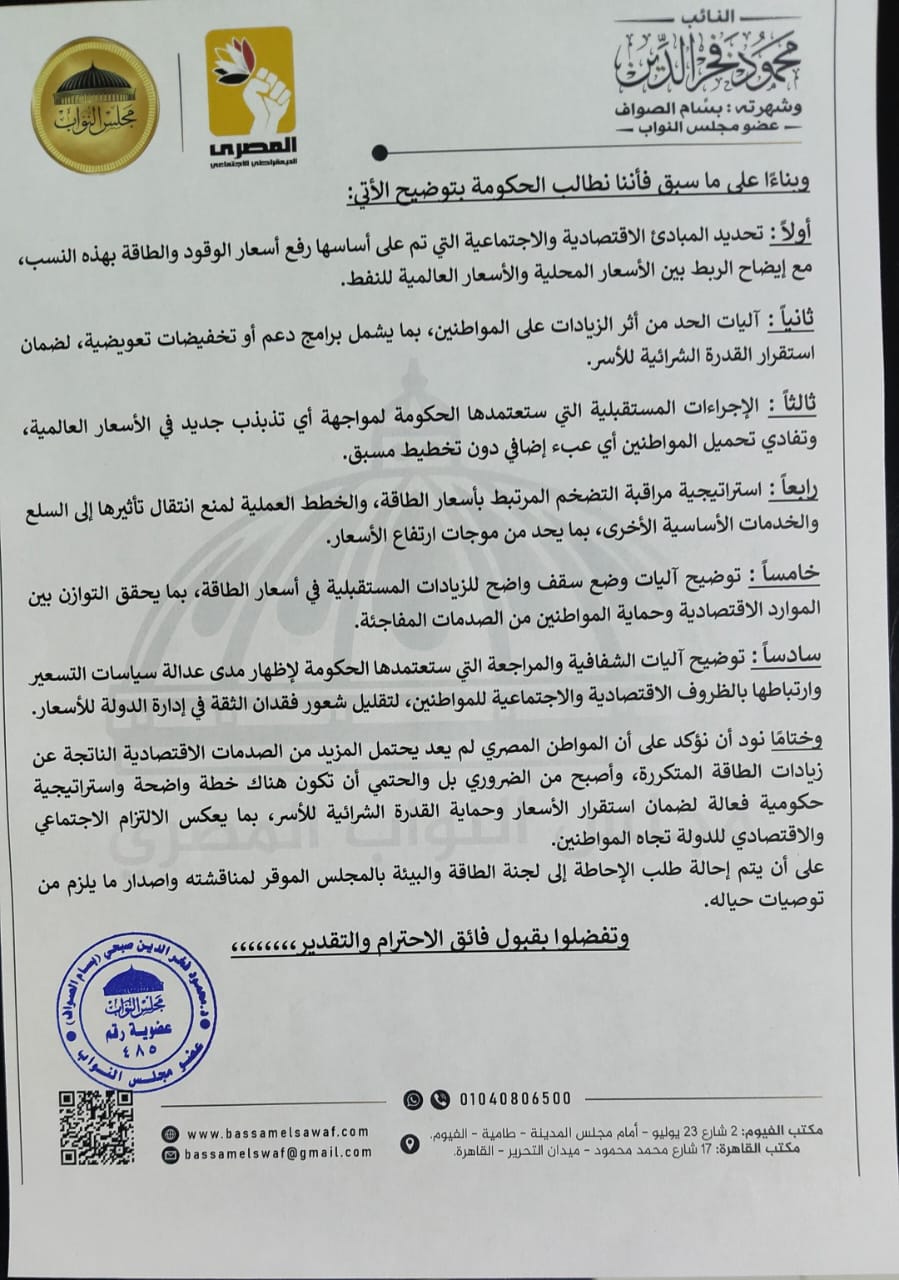 تقدم النائب بسام الصواف عضو مجلس النواب عن الحزب المصري الديمقراطي الاجتماعي بطلب إحاطة إلي المستشار هشام بدوي رئيس مجلس النواب ، موجه إلى رئيس مجلس الوزراء ووزير البترول والثروة المعدنية بشأن : الارتفاع الغير مسبوق في أسعار المحروقات ، وما يترتب على ذلك من تداعيات خطيرة على المواطنين والاقتصاد الوطني.