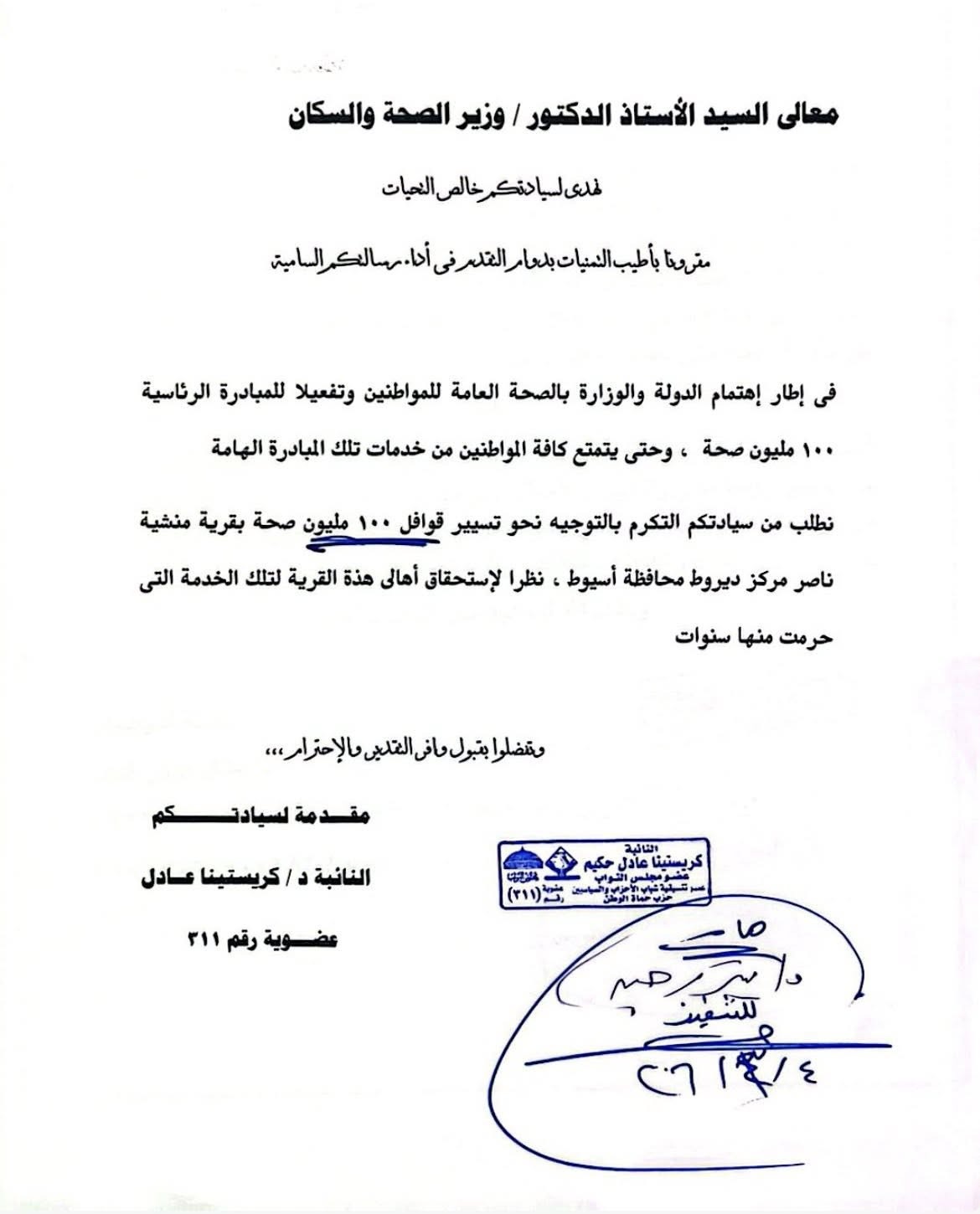 أوضحت النائبة أنها تتقدم بالشكر لفخامة عبد الفتاح السيسي ولمعالي الدكتور وزير الصحة على الموافقة على استثناء قرية منشية ناصر من شروط المبادرة، وإطلاق القافلة بها وفق التوجيهات الصادرة بتاريخ 4-3-2026.