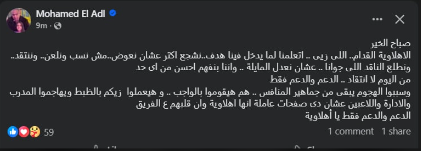 وفي هذا السياق، وجه محمد العدل، رئيس قناة النادي الأهلي السابق، رسالة إلى جماهير القلعة الحمراء عبر حسابه الرسمي على موقع فيسبوك، طالب خلالها بضرورة دعم الفريق في هذه المرحلة المهمة، وقال العدل في رسالته إن الجماهير الأهلاوية عبر التاريخ كانت دائمًا عنصرًا حاسمًا في دعم الفريق خلال الأوقات الصعبة.
