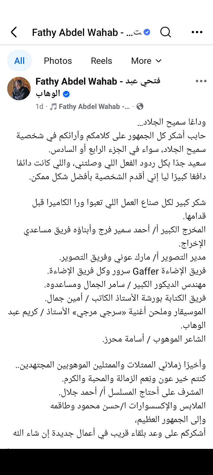 استهل الفنان القدير فتحي عبد الوهاب منشوره بإعلان وداعه الرسمي لشخصية "سميح الجلاد"، وهي الشخصية المثيرة للجدل التي قدمها ضمن أحداث مسلسل "المداح". وقد أعرب في مستهل حديثه عن عميق امتنانه لجمهوره المتابع، مؤكداً أن آراءهم وتفاعلهم مع الشخصية، سواء في الجزء الرابع أو الخامس والذي أشار إليه في سياق المنشور، كانت هي المحرك الأساسي والحافز الأكبر له لتقديم الدور بأفضل صورة فنية ممكنة، وذلك وفقا لما رصده موقع تحيا مصر.
