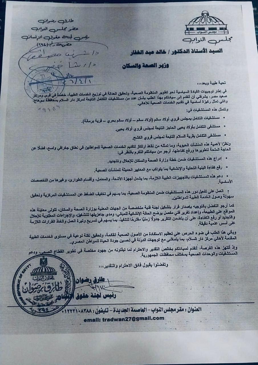 النائب طارق رضوان يطالب وزير الصحة بتطوير مستشفيات التكامل بمركز دار السلام في سوهاج