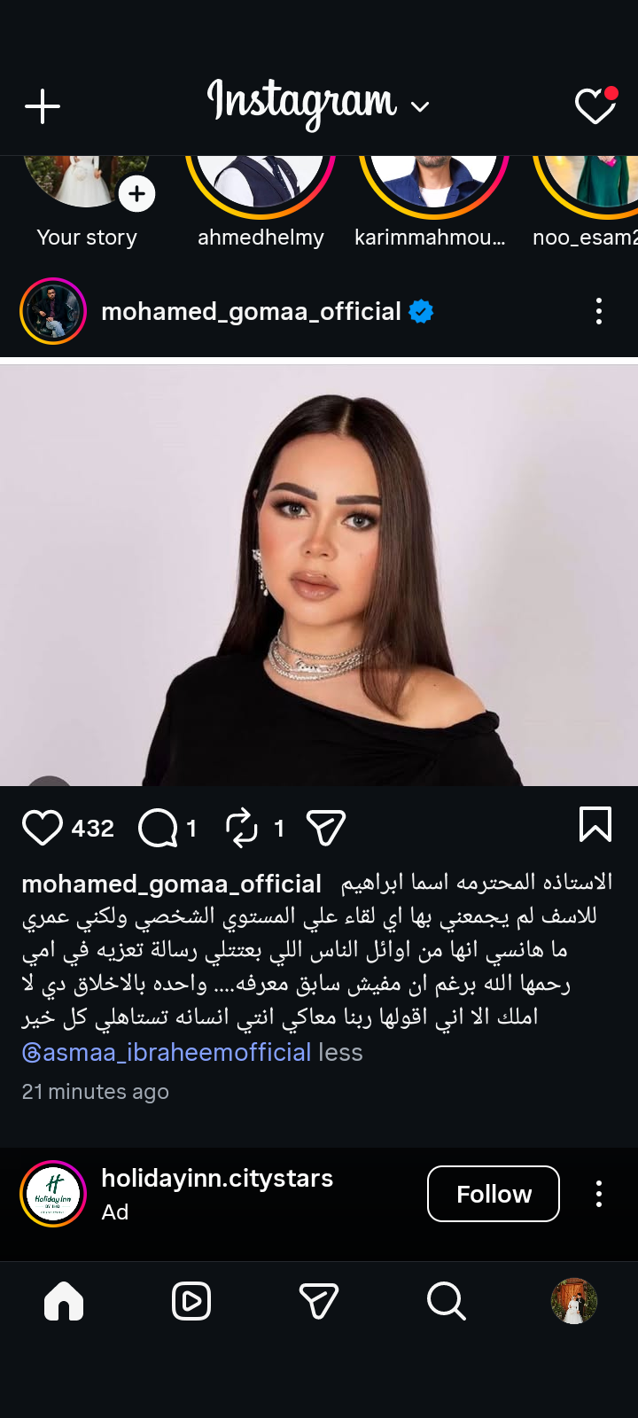 وكتب محمد جمعة على حسابه الرسمي بموقع تبادل الصور والفيديوهات انستجرام في منشور رصده موقع تحيا مصر، مرفقا صورة أسماء جلال: المحترمة أسما إبراهيم للاسف لم يجمعني بها أي لقاء علي المستوى الشخصي ولكني عمري ما هانسي انها من أوائل الناس اللي بعتتلي رسالة تعزيه في أمي رحمها الله برغم إن مفيش سابق معقرفه.... واحدة بالأخلاق دي لا أملك إلا أني أقولها ربنا معاكي أنتي انسانة تستاهلي كل خير.