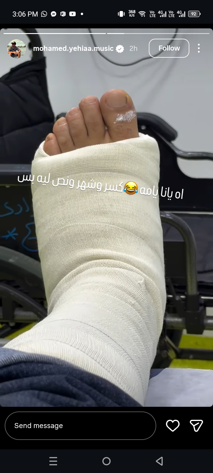 وشارك الملحن محمد يحيي، صورة له من المستشفى وبالجبيرة، وفقا لما رصده موقع تحيا مصر، وذلك عبر استوري صفحته الرسمية على موقع التواصل الاجتماعي إنستجرام، وعلق عليها مازحا: آه يانا يا أما.. كسر شهر ونص ليه بس.