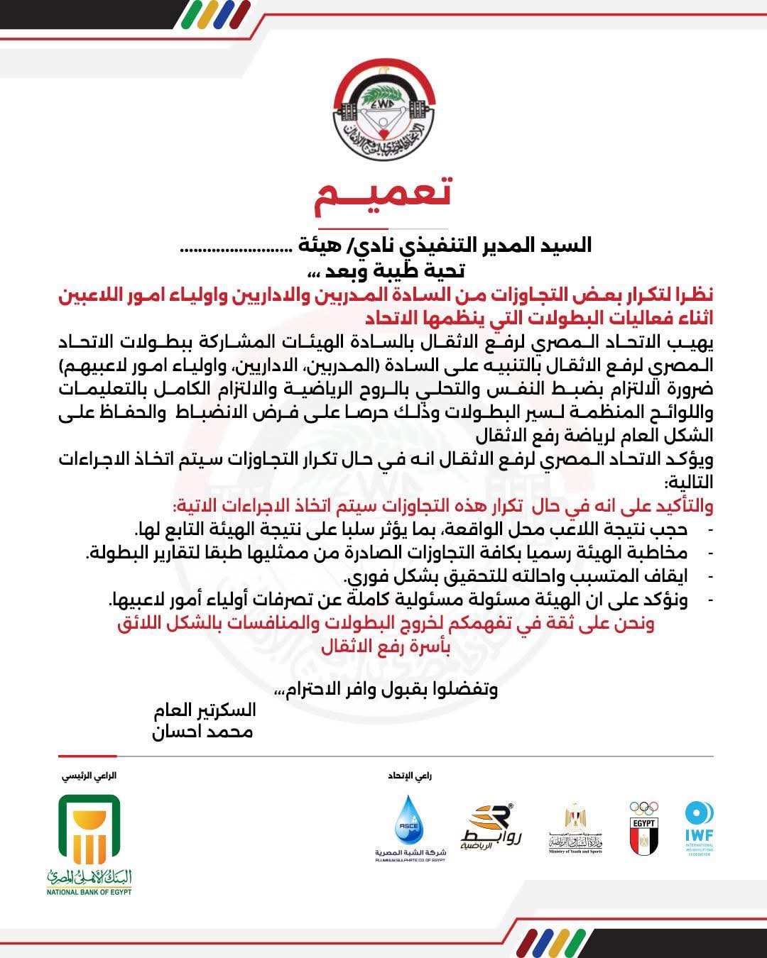 وجاء في التعميم أن الاتحاد المصري لرفع الأثقال رصد خلال الفترة الأخيرة بعض التجاوزات الرياضية من جانب بعض المدربين والإداريين وأولياء الأمور أثناء فعاليات البطولات التي ينظمها الاتحاد، وهو ما استدعى التشديد على ضرورة الالتزام الكامل باللوائح.