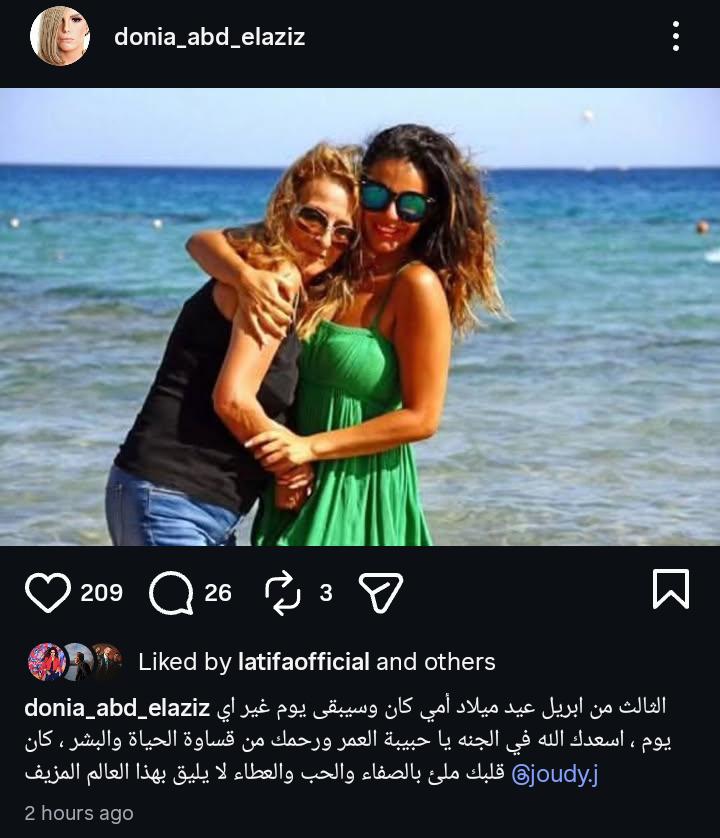 وشاركت الفنانة دنيا عبد العزيز، صورة تجمعها بوالدتها الراحلة، وفقا لما رصده موقع تحيا مصر، عبر صفحتها الرسمية على موقع التواصل الاجتماعي إنستجرام، وعلقت عليها: الثالث من ابريل عيد ميلاد أمي كان وسيبقى يوم غير اي يوم ، اسعدك الله في الجنه يا حبيبة العمر ورحمك من قساوة الحياة والبشر ، كان قلبك ملئ بالصفاء والحب والعطاء لا يليق بهذا العالم المزيف.