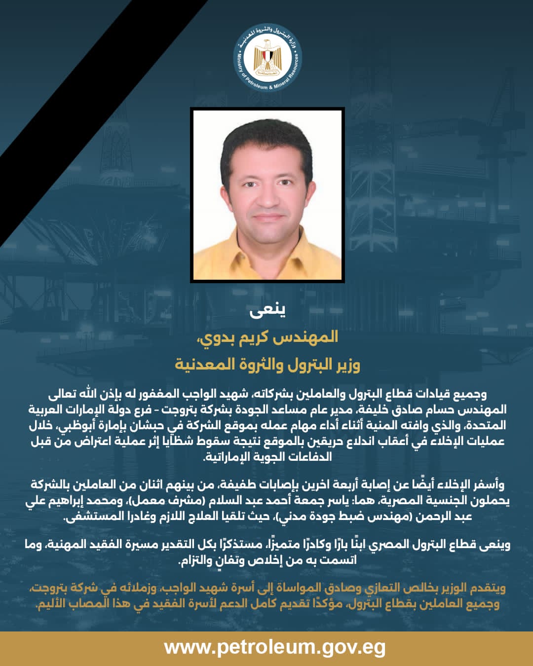 ينعى المهندس كريم بدوي، وزير البترول والثروة المعدنية، وجميع قيادات قطاع البترول والعاملين بشركاته، شهيد الواجب المغفور له بإذن الله تعالى المهندس حسام صادق خليفة، مدير عام مساعد الجودة بشركة بتروجت – فرع دولة الإمارات العربية المتحدة، والذي وافته المنية أثناء أداء مهام عمله بموقع الشركة في حبشان بإمارة أبوظبي، خلال عمليات الإخلاء في أعقاب اندلاع حريقين بالموقع نتيجة سقوط شظايا إثر عملية اعتراض من قبل الدفاعات الجوية الإماراتية.