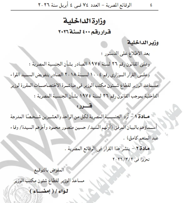 نشرت الجريدة الرسمية اليوم السبت، قرار وزير الداخلية رقم 400 لسنة 2026، والذي يحتوي على رد الجنسية المصرية، لـ 21 شخصا، ونشر القرار في الوقائع المصرية.