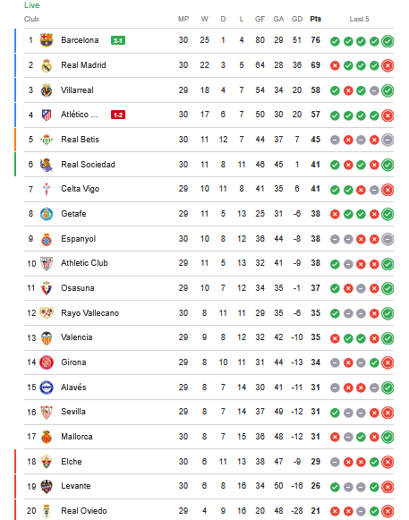 - ترتيب الدوري الإسباني النهائي بعد القمة