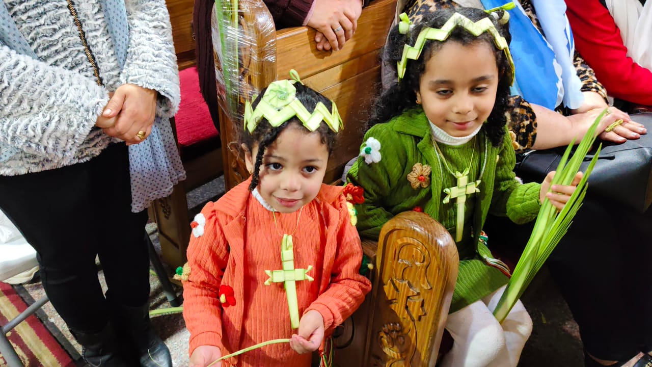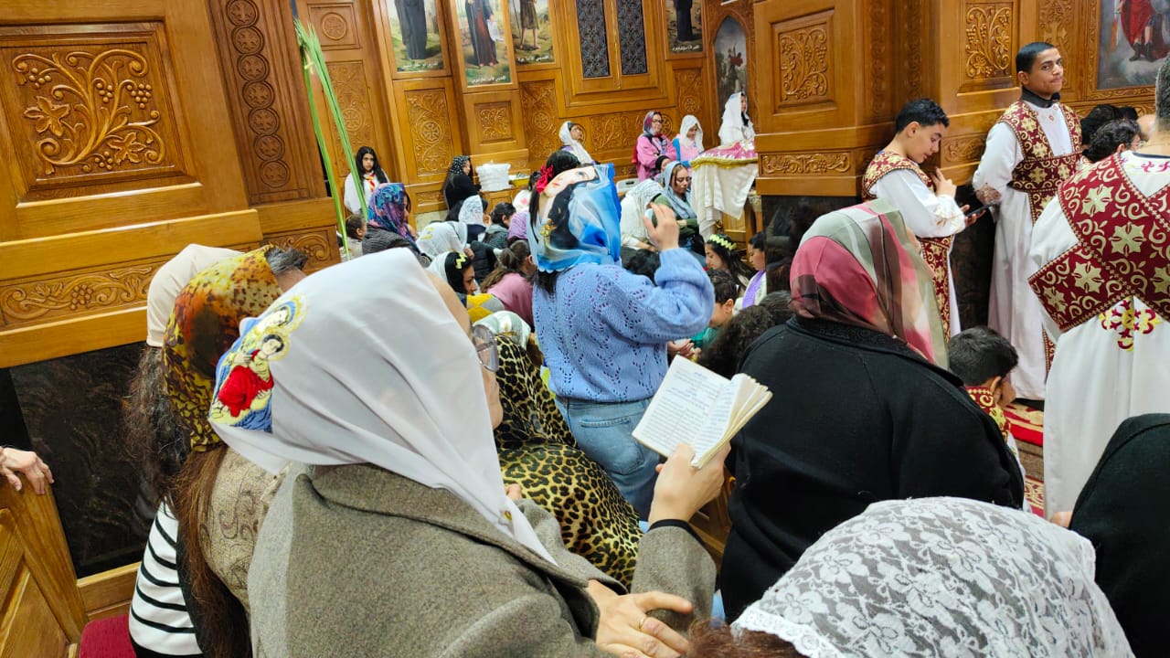 "تيجان وصلبان من السعف والزيّ الملوكي".. بهجة أحد الشعانين تزين كنيسة الأنبا بيشوي ببورسعيد