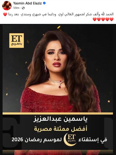 ياسمين عبد العزيز تحتفل بجائزة أفضل ممثلة في رمضان 2026