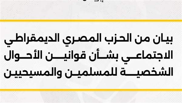 ويؤكد الحزب المصري الديمقراطي الاجتماعي أن التأخير في تقديم الحلول التشريعية الممكنة لقضايا تمس حياة الناس بشكل يومي لم يعد مقبولًا، وأن المسؤولية الوطنية تقتضي التحرك الجاد والسريع لإنجاز قوانين أحوال شخصية عادلة وحديثة، للمسلمين والمسيحيين، تضع مصلحة الأسرة المصرية فوق أي اعتبارات أخرى.