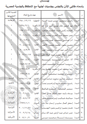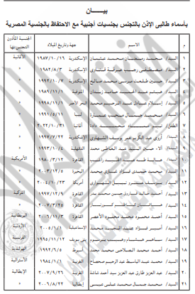 وتضمن القرار الإذن لـ21 مواطنًا، تبدأ أسماؤهم بمحمد رمضان محمد عثمان وتنتهي بمحمد جمال محمد علي عيسى، بالحصول على جنسيات أجنبية مع الاحتفاظ بالجنسية المصرية، وفقًا للكشوف المرفقة.