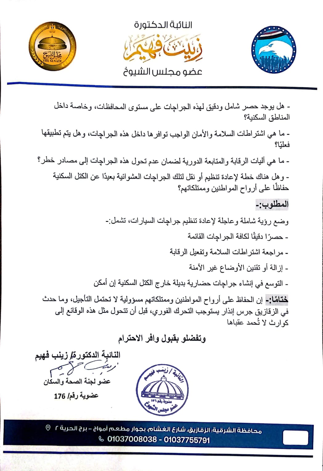 تقدمت النائبة الدكتورة زينب فهيم، عضو مجلس الشيوخ، أمين المرأة عن حزب مستقبل وطن بالشرقية، بطلب اقتراح برغبة موجه إلى الدكتور مصطفى مدبولي رئيس مجلس الوزراء، والدكتورة منال عوض وزيرة التنمية المحلية والبيئة، بشأن ضرورة مراجعة وتنظيم أوضاع الجراجات ومواقف السيارات داخل الكتل السكنية، في ضوء ما شهدته مدينة الزقازيق صباح اليوم من حادث اشتعال جراج سيارات بمنطقة الغشام، والذي أسفر عن احتراق عدد من السيارات، وبث حالة من الذعر بين الأهالي.