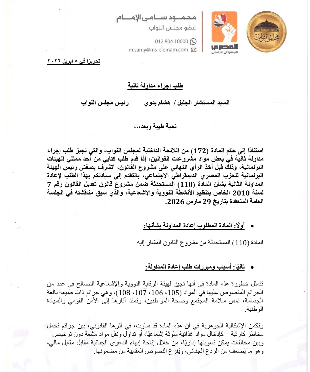 وأشار إلى أنه تقدم بالطلب بصفته رئيس الهيئة البرلمانية للحزب المصري الديمقراطي الاجتماعي، لإعادة المداولة الثانية بشأن المادة (110) المستحدثة ضمن مشروع قانون تعديل القانون رقم 7 لسنة 2010 الخاص بتنظيم الأنشطة النووية والإشعاعية، والذي سبق مناقشته في الجلسة العامة المنعقدة بتاريخ 29 مارس 2026.