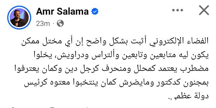 وقال عمرو سلامة في منشور رصده موقع تحيا مصر على حسابه الرسمي بموقع التواصل الاجتماعي فيسبوك: الفضاء الإلكتروني أثبت بشكل واضح إن أي مختل ممكن يكون ليه متابعين وتابعين وألتراس ودراويش، يخلوا مضطرب يعتمد كمحلل ومنحرف كرجل دين وكمان يعترفوا بمجنون كدكتور ومايضرش كمان ينتخبوا معتوه كرئيس دولة عظمى.