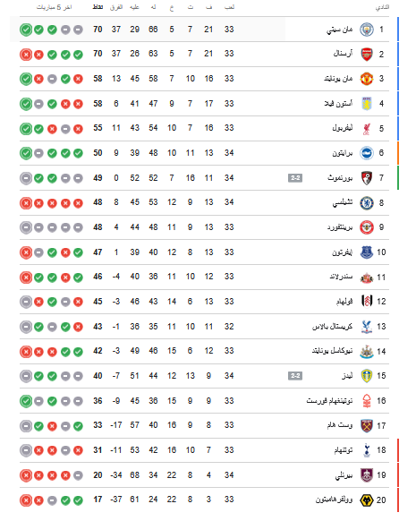 - جدول ترتيب الدوري الإنجليزي الممتاز
