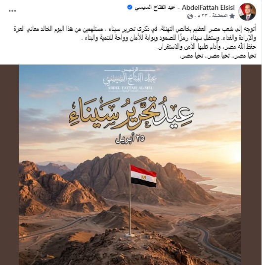 وقال الرئيس السيسي: أتوجه إلى شعب مصر العظيم بخالص التهنئة، في ذكرى تحرير سيناء ، مستلهمين من هذا اليوم الخالد معاني العزة والإرادة والفداء. وستظل سيناء رمزًا للصمود وبوابة للأمان وواحة للتنمية والبناء .