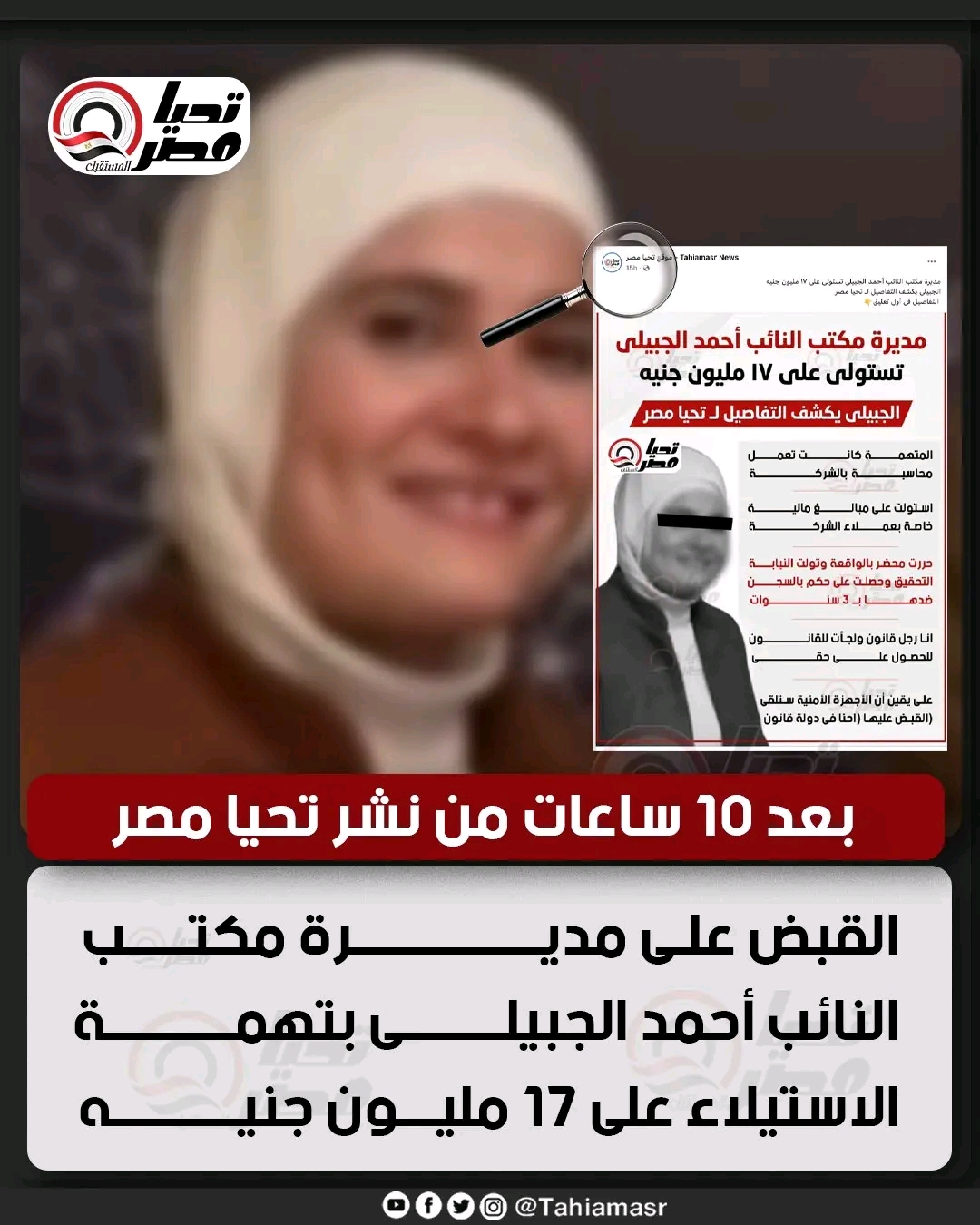 ألقت الأجهزة الأمنية القبض على مديرة مكتب النائب أحمد الجبيلي، عضو مجلس النواب، على خلفية اتهامها بالاستيلاء على مبلغ مالي يُقدّر بـ17 مليون جنيه، وذلك بعد ساعات من انفراد موقع “تحيا مصر” بنشر تفاصيل الواقعة.