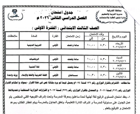▪️تعقد امتحانات الصف الثالث الابتدائي علي مدار ٤ أيام تبدأ من يوم الأربعاء الموافق ١٣-٥-٢٠٢٦ وتنتهي يوم الاثنين الموافق ١٨-٥-٢٠٢٦.