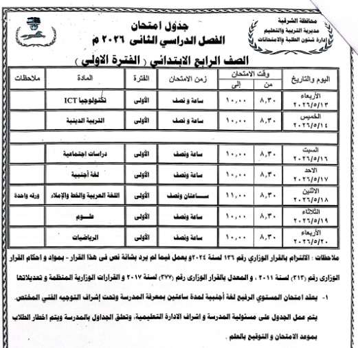 محافظ الشرقية يعتمد جدول امتحانات الفصل الدراسي الثاني للعام الدراسي ٢٠٢٥ / ٢٠٢٦