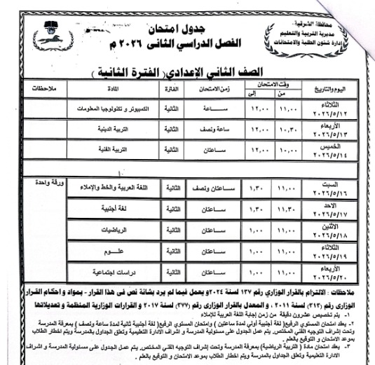 ▪️تعقد امتحانات الصفوف الاول والثاني الاعدادي عام علي مدار ٨ أيام تبدأ يوم الثلاثاء ١٢-٥-٢٠٢٦ وتنتهي يوم الأربعاء ٢٠-٥-٢٠٢٦.