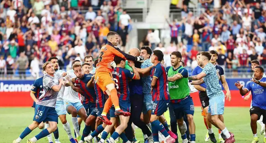 وجاءت المباراة التي أقيمت ضمن منافسات الدوري الإسباني الدرجة الثانية متوترة حتى اللحظات الأخيرة، في ظل تقدم هويسكا بهدف دون رد، قبل أن تنفجر الأوضاع داخل أرض الملعب.