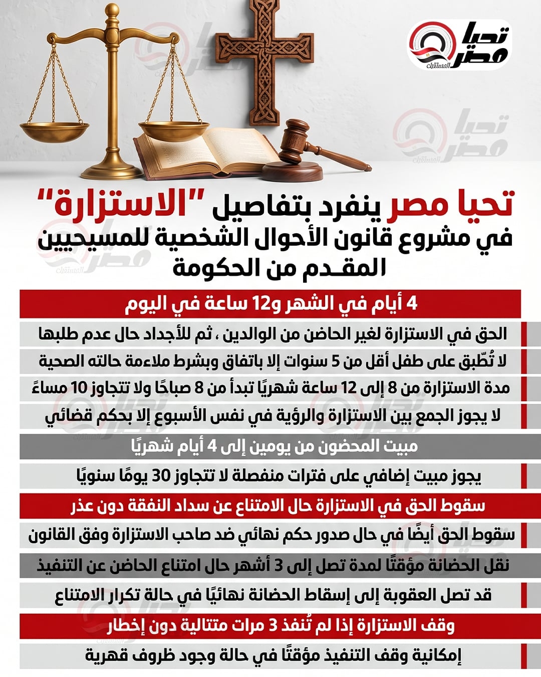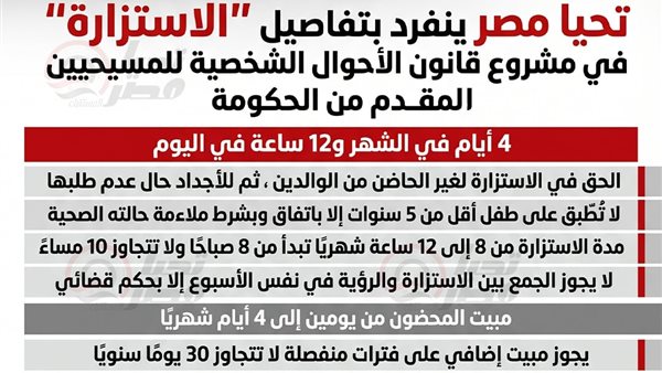 4 أيام في الشهر و12 ساعة في اليوم ..تحيا مصر ينفرد بتفاصيل “الاستزارة” في مشروع قانون الأحوال الشخصية للمسيحيين المقدم من الحكومة