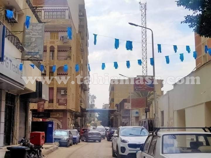 وقام المواطنين بوضع قفازات مستعملة " زينة رمضان " داخل احد الشوارع بوسط المدينة داخل حي السويس في محافظة السويس.