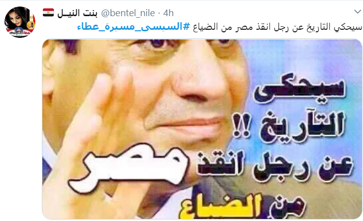 ودشن المصريون اليوم هاشتاج "السيسى مسيرة عطاء"، لرصد انجازات الرئيس خلال السنوات الماضية، وأيضا قدرته على النمو الاقتصادى بمصر، والمشاريع القومية التى بدأها قبل سنوات، ومشاريع أخرى يواصل التقدم بها.