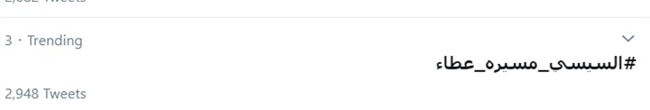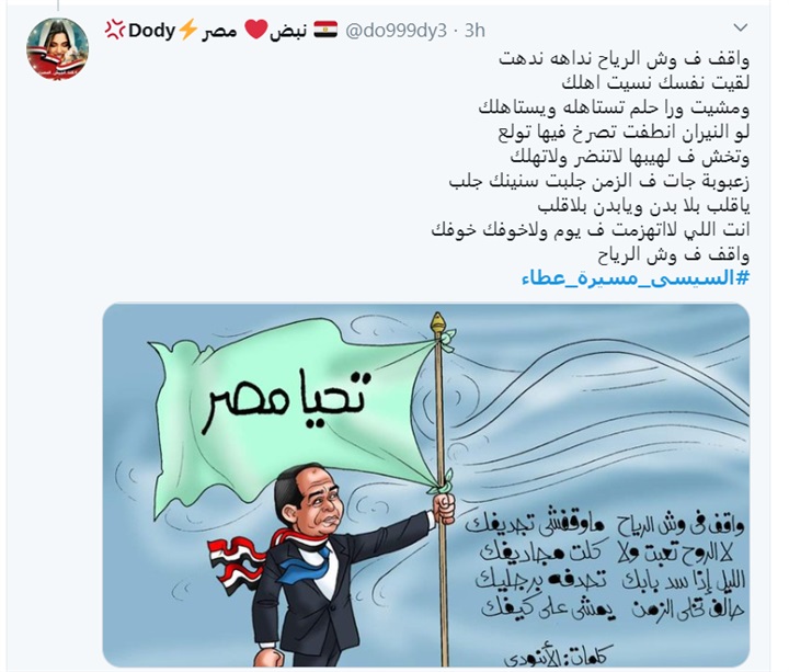 وتصدر هاشتاج السيسي مسيرة عطاء موقع تويتر بعد تصريحاته النارية اليوم، ضد قوى الشر والمهاجمين للدولة المصرية، وكتم أفواه الداعيين لهدم الدولة. في ثوب مطالبات بالتغيير.