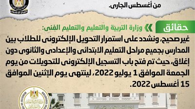 وزارة التربية والتعليم والتعليم الفني أخبار نفت غلق باب تحويلات المدارس 2022، مؤكدة أنه لا صحة لإغلاق باب التحويلات بين المدارس بدءاً من شهر أغسطس الجاري، مُشددةً على استمرار التحويل الإلكتروني للطلاب بين المدارس بجميع مراحل التعليم الابتدائي والإعدادي والثانوي دون إغلاق، حيث تم فتح باب التسجيل الإلكتروني للتحويلات من يوم الجمعة الموافق 1 يوليو 2022، لينتهي يوم الإثنين الموافق 15 أغسطس 2022.