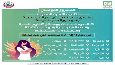 ونوه «عبدالغفار» إلى إطلاق 13 قافلة طبية أخرى يومي 14 و15 سبتمبر بمناطق ميت السراج مركز المحلة اول محافظة الغربية، ورفاعة مركز قوص محافظة قنا، والمثانى مركز النجيلة محافظة مطروح، والقرية بالدوير مركز طما محافظة سوهاج، ومركز طبي بالأسمرات حي المقطم محافظة القاهرة، وحماطة - ابو غصون مركز مرسى علم محافظة البحر الأحمر، والتضامن مركز سمسطا محافظة بنى سويف، وعزبة سليم مركز ادفو شرق محافظة أسوان، وكفر هلال مركز بركة السبع محافظة المنوفية، والزعفرانى مركز كوم حمادة محافظة البحيرة، والرويسات، مركز شرم الشيخ محافظة جنوب سيناء، ومنشية ناصر مركز كفر سعد محافظة دمياط، ومنقطين مركز سمالوط محافظة المنيا.