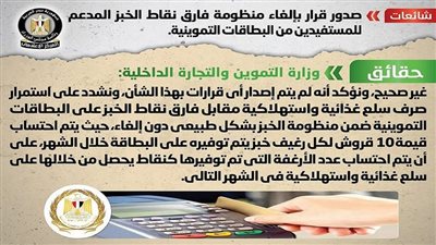 كما انتشر في بعض المواقع الإلكترونية وصفحات التواصل الاجتماعي أنباء بشأن صدور قرار بإلغاء منظومة فارق نقاط الخبز المدعم للمستفيدين من البطاقات التموينية، وقد قام المركز الإعلامي لمجلس الوزراء بالتواصل مع وزارة التموين والتجارة الداخلية، والتي نفت تلك الأنباء.