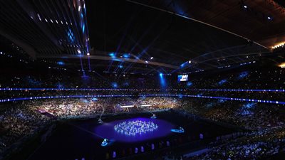 وبدأ الحفل بآيات من القرآن الكريم، وعرض حول الحضارة القطرية والعربية، وما تتميز به من الثقافة الشرقية، إلى جانب الحضارة الغربية التي يمثلها الممثل الأمريكي مورجان فيرمان، والشرقية يمثلها الشاب غانم المفتاح، حيث تمد الحضارتان يديها إلى بعضها.