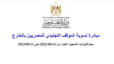 وأعلنت وزارة الخارجية أنه يمكن التسجيل في مبادرة تسوية المواقف التجنيدية بشكل نهائي للمواطنين المصريين المقيمين بالخارج وذلك اعتبارا من 14/8/2023 ولمدة ثلاثين يوماً.