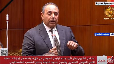 ووسط عاصفة من التصفيق، قال رئيس مجلس الشيوخ: نؤيد وندعم الرئيس عبد الفتاح السيسي، في كل ما يتخذه من إجراءات لحماية الأمن القومي المصري، وتأمين حدود الدولة، ودعم الشعب الفلسطيني، ويدعو مجلس الشيوخ الشعب المصري - بكل طوائفه- إلى التكاتف صفًا واحدًا خلف فخامة السيد رئيس الجمهورية والقوات المسلحة الباسلة.