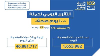 أعلن الدكتور خالد عبدالغفار نائب رئيس مجلس الوزراء ووزير الصحة والسكان، تقديم 47 مليون و431 ألف و927 خدمة طبية من خلال حملة «100 يوم صحة» منذ إطلاق الدكتور مصطفى مدبولي رئيس مجلس الوزراء، للنسخة الثانية، مساء يوم 31 يوليو 2024، وحتى مساء أمس الجمعة 30 أغسطس، في جميع محافظات الجمهورية، برعاية الرئيس عبدالفتاح السيسي.
