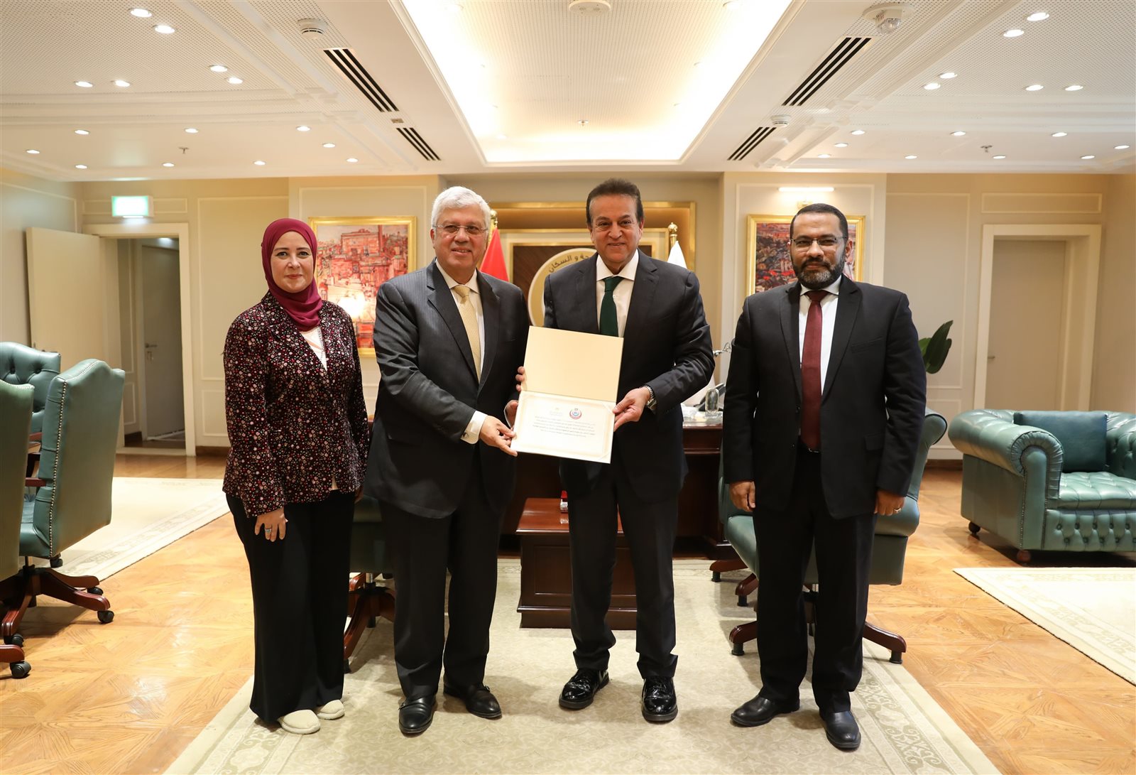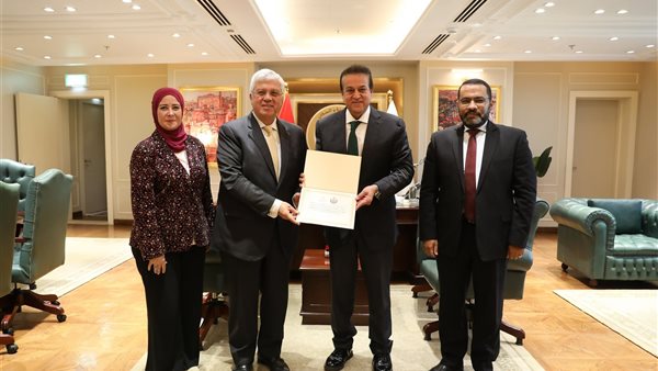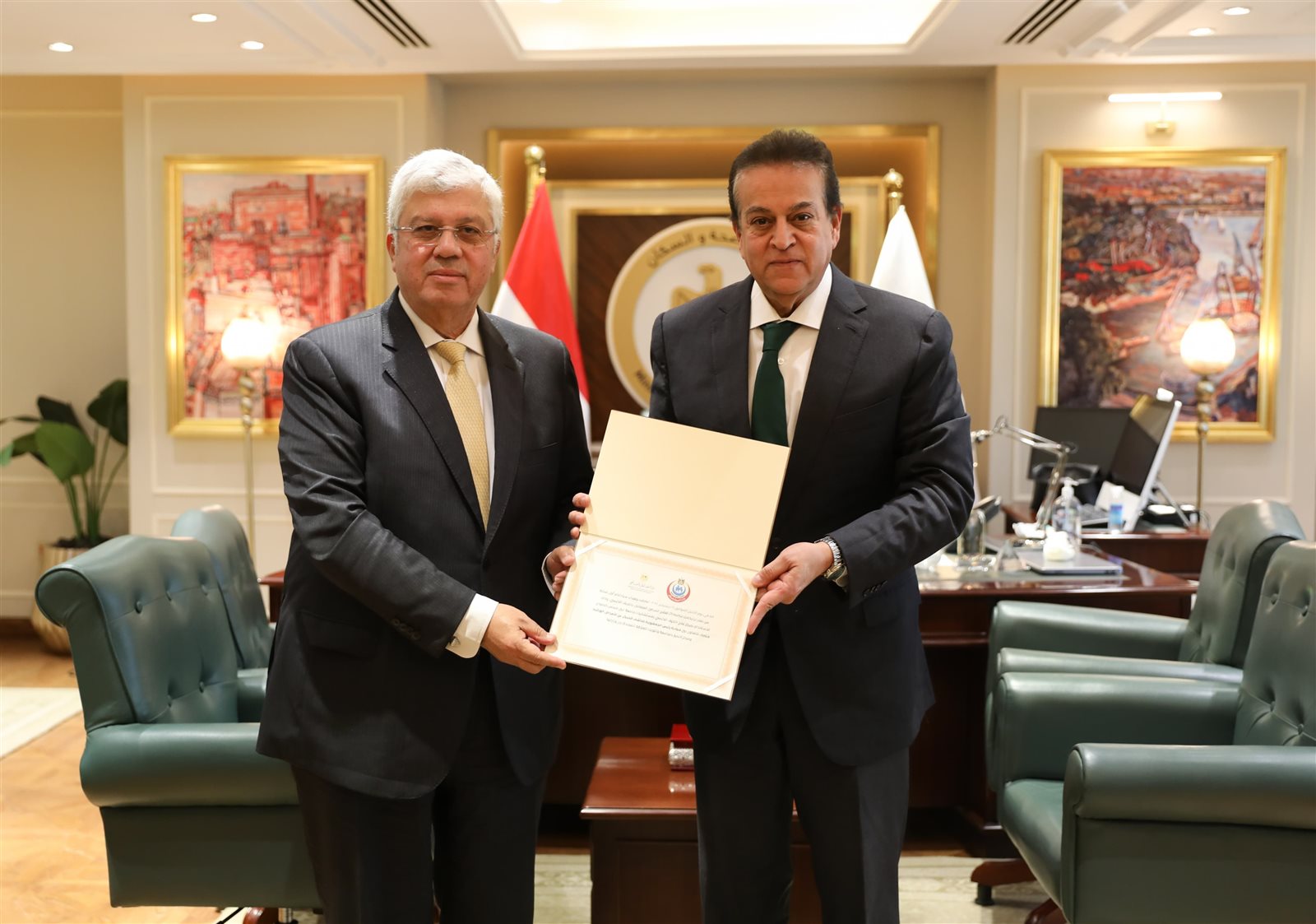 الدكتور خالد عبدالغفار يسلم وزير التعليم العالي وثيقة استلام أول شحنة من العقار لعلاج التليف الكيسي