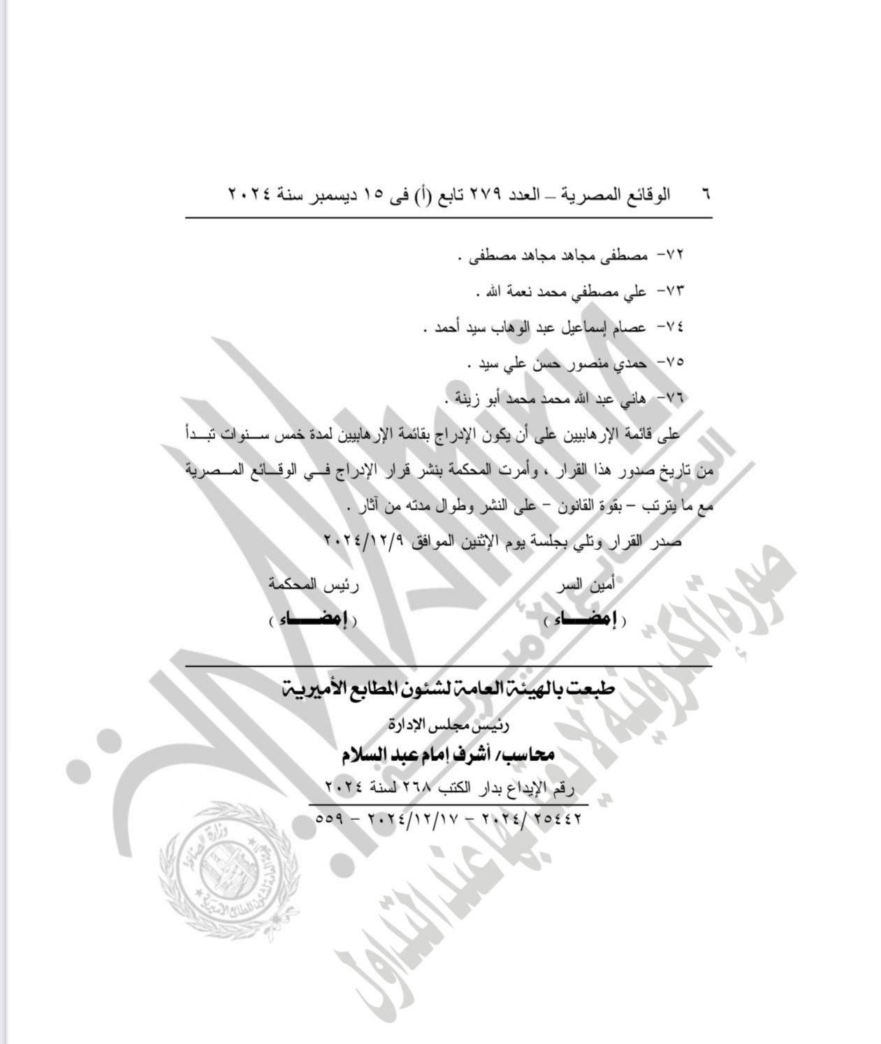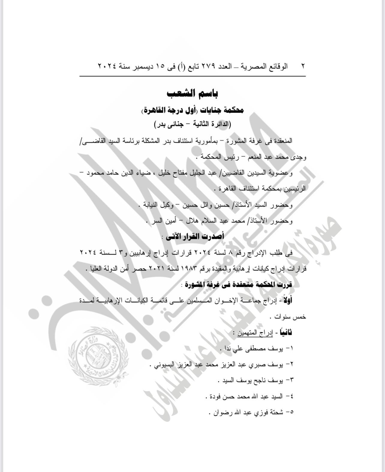 نشرت الجريدة الرسمية في عددها الصادر بتاريخ 15 ديسمبر حكم محكمة الجنايات الدائرة الثانية " جنائي بدر"، برئاسة المستشار وجدي محمد عبد المنعم، وعضوية كلا من المستشار عبد الجليل مفتاح والمستشار ضياء الدين حامد، بإدراج 76 متهما على قوائم الارهابيين، على أن يكون الاداراج لمدة 5 سنوات.