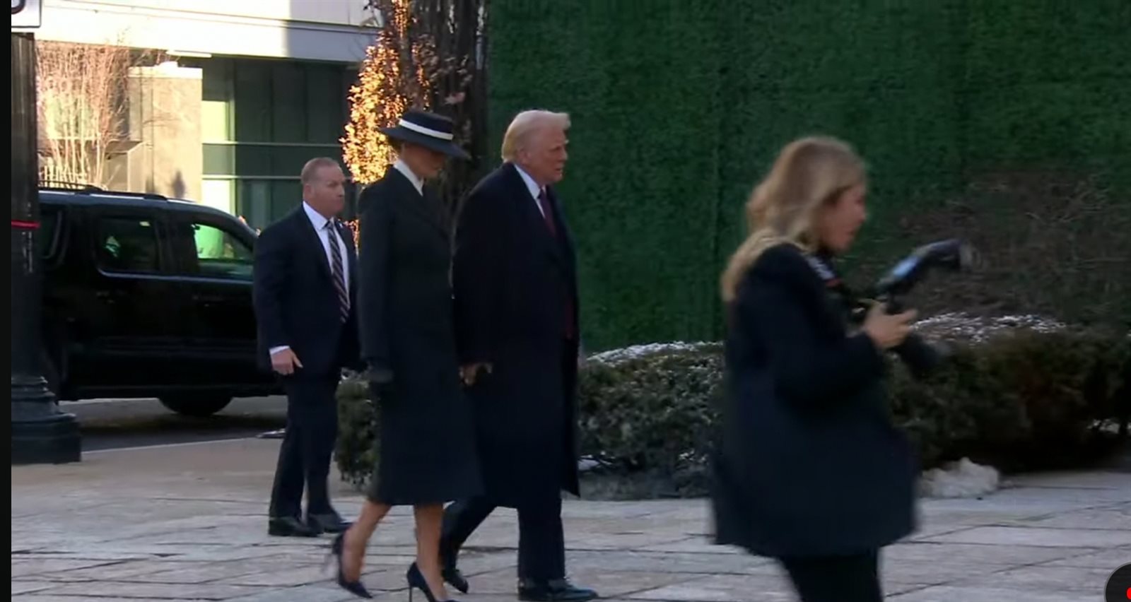وظهر ترامب في اللقطات المصورة وهو يرتدي بدلة ومعطفًا مفتوح الأزرار وربطة عنق كستنائية اللون، وهو يبتسم ويرفع قبضته عند وصوله إلى الكنيسة. فيما ظلت ميلانيا ترتدي قبعة سوداء أنيقة ومعطفًا، وحافظت على هدوئها بينما كانت تمسك بيد زوجها.