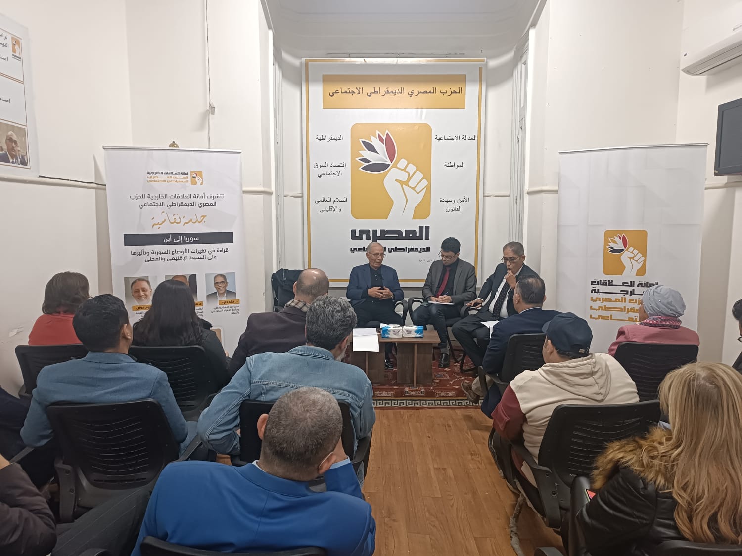 عقدت أمانة العــلاقـات الخـارجيـة بالحـزب المصـري الديمقـراطــي الاجتمـاعــي حلقـة نقـاشيـة بعنـوان "سـوريـا إلى أيـن؟ قراءة في تغيرات الأوضـاع السوريـة وتأثيرها على المحيط الإقليمي والمحلي".