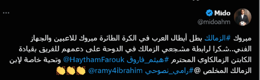 وكتب أحمد حسام ميدو عبر "إكس"، مبروك للزمالك بطل أبطال العرب في الكرة الطائرة ومبروك للاعبين والجهاز الفني.