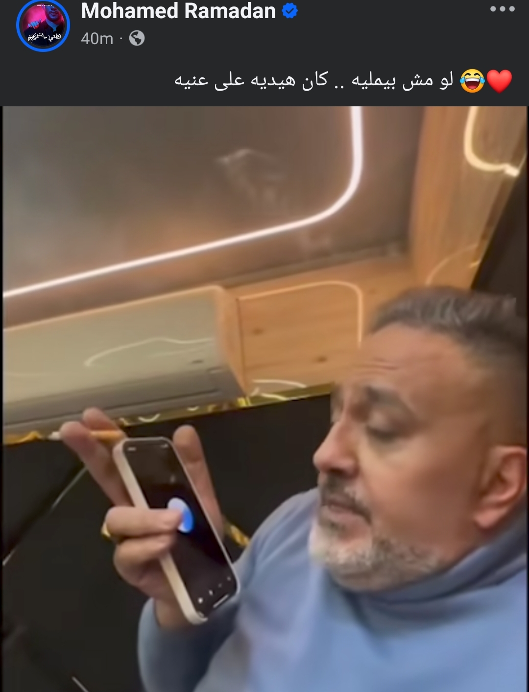 أرفق الفنان محمد رمضان مقطع مصور للفنان خالد سرحان وهو يتحدث مع تطبيق الذكاء الاصطناعي على طريقة محمد رمضان، ويسخر منه وعلق محمد رمضان على مقطع الفيديو عبر حسابه الرسمي على موقع التواصل الاجتماعي فيسبوك والذي يرصده موقع تحيا مصر وكتب محمد رمضان: "لو مش بيمليه .. كان هيديه على عنيه".