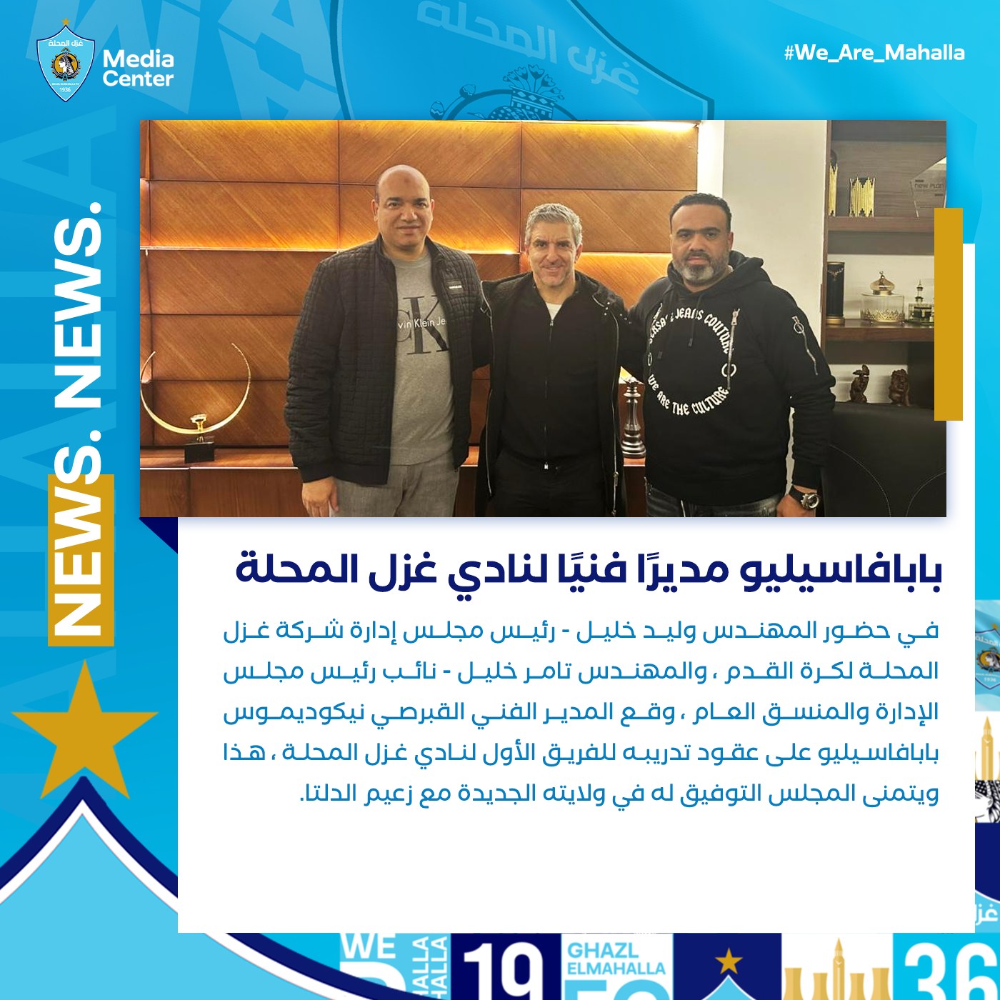وفي في بداية بيان غزل المحلة، في حضور المهندس وليد خليل رئيس مجلس إدارة شركة غزل المحلة لكرة القدم والمهندس تامر خليل نائب رئيس مجلس الإدارة والمنسق العام، وقع المدير الفني القبرصي نيكوديموس بابافاسيليو على عقود تدريبه للفريق الأول لنادي غزل المحلة.