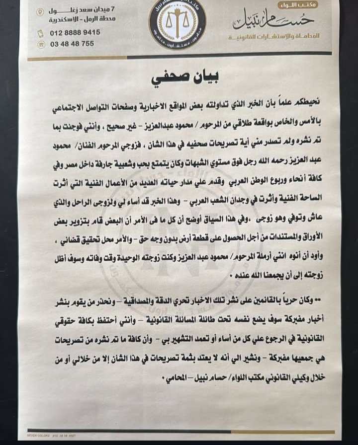 وقالت بوسي شلبي في البيان الذى رصده موقع تحيا مصر منذ قليل: نحيطكم علما بأن الاخبار المتداولة في المواقع الإخبارية وصفحات مواقع التواصل الاجتماعي بالأمس بواقعة طلاقي من من محمود عبد العزيز غير صحيح، وأنني فوجئت بما تم نشره ولم تصدر مني اي تصريحات صحفية في هذا الشأن، فزوجي محمود عبد العزيز فوق مستوى الشبهات وكان يتمتع بشعبية جارفة في مصر وجميع أنحاء الوطن العربي.