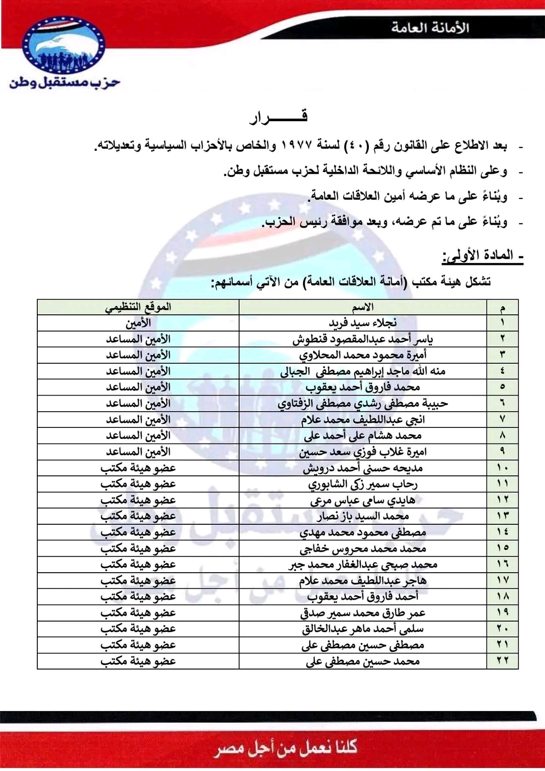 قرار جديد بتشكيل هيئة أمانة العلاقات العامة بحزب مستقبل وطن