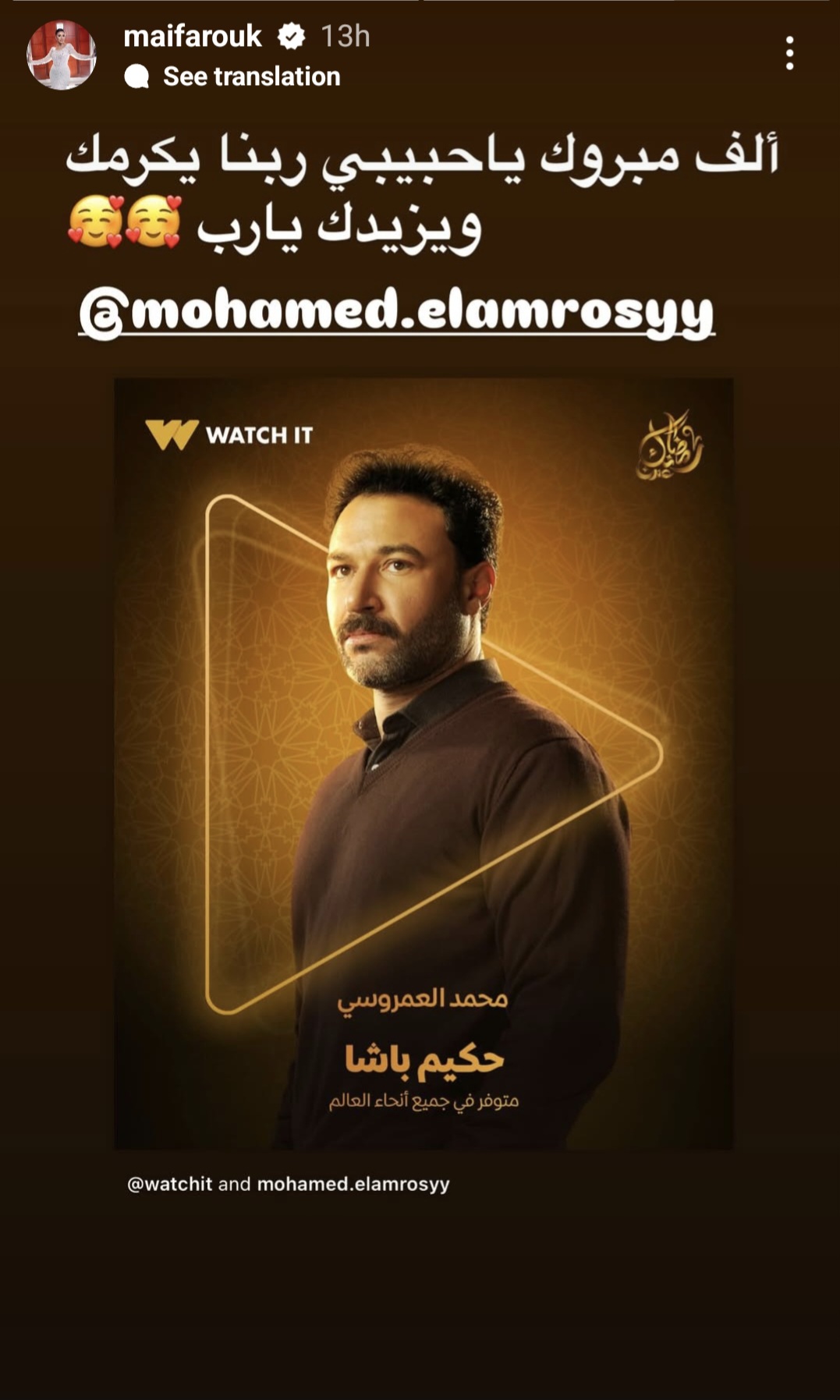 وأعادت مي فاروق نشر بوستر محمد العمروسي في مسلسل حكيم باشا الذي يرصده موقع تحيا مصر من خلال خاصية استوري، وكتبت: ألف مبروك يا حبيبي ربنا يكرمك ويزيدك يارب.