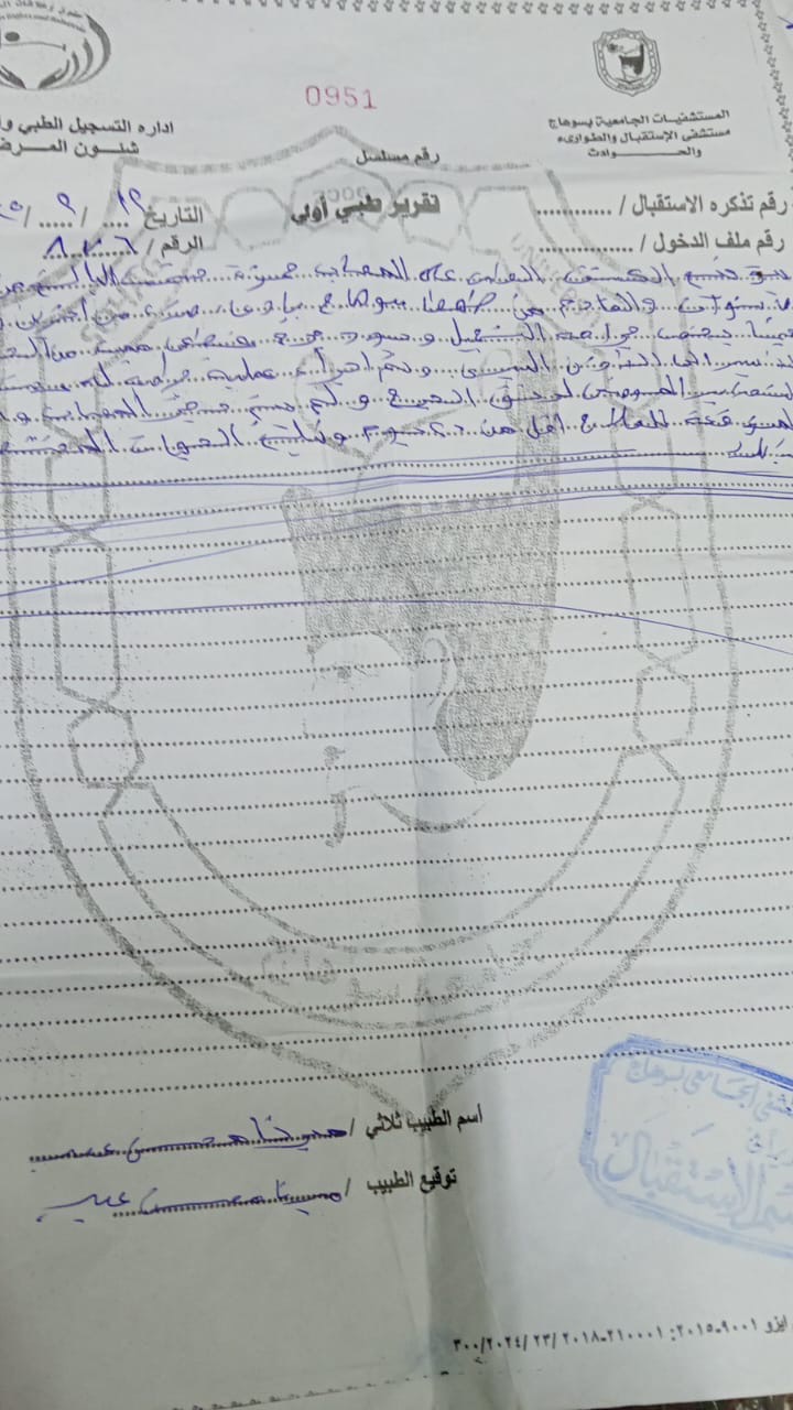 التقرير الطبي الخاص بطالب الصف الثاني الإبتدائي الذي تعرض لإصابة خطيرة في الوجه إثر التعدي عليه من طالبين آخرين بموس حلاقة في مدرسة بسوهاج