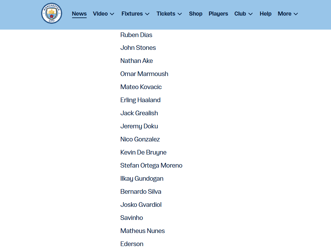 خط الوسط: نونيز، نيكو جونزاليس، برناردو سيلفا، إلكاي جاندوجان، جيمس مكاتي، ماتيو كوفاسيتش، كيفين دي بروين.